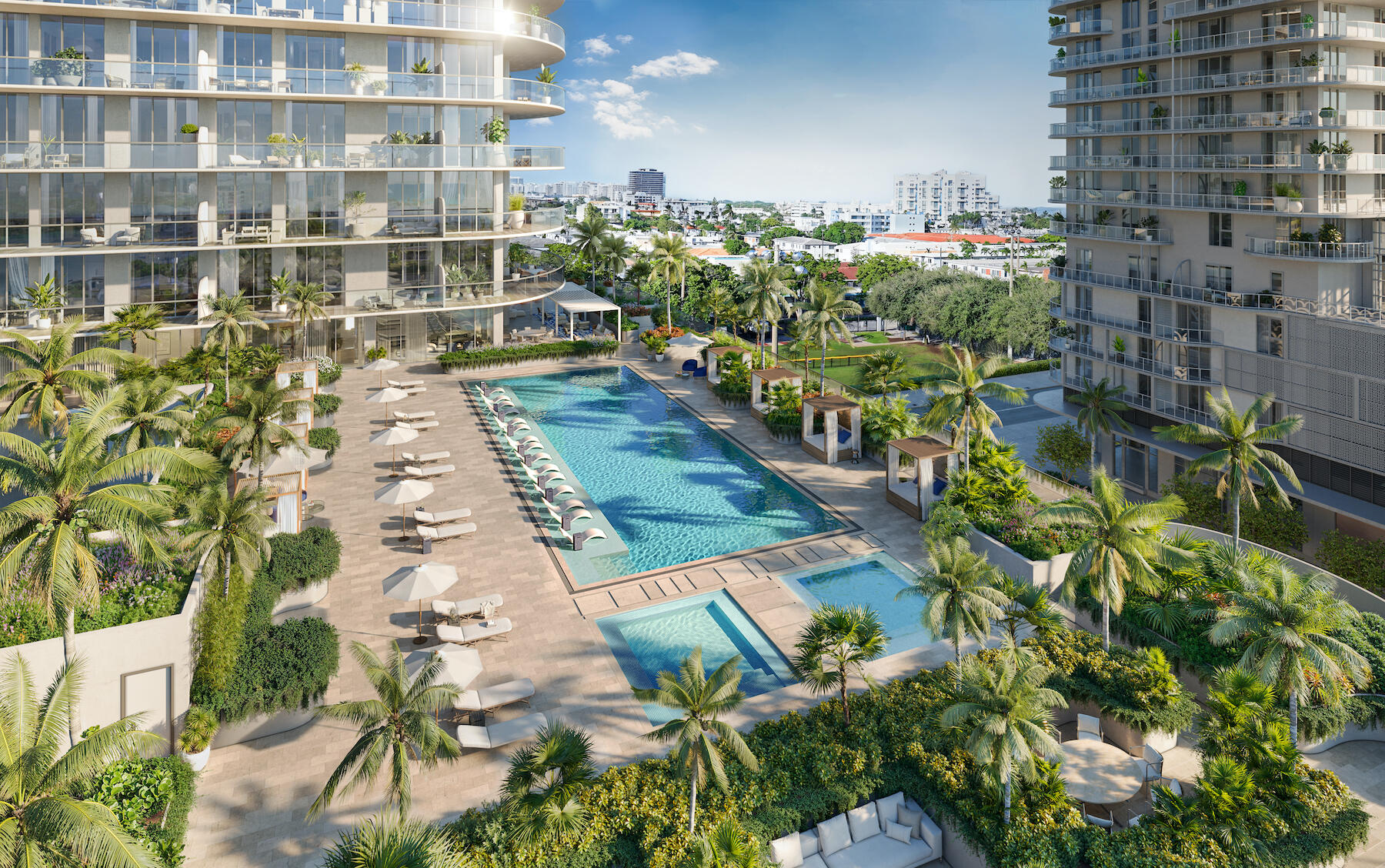 - Lavishly landscaped resort pool with pool-side cabanas